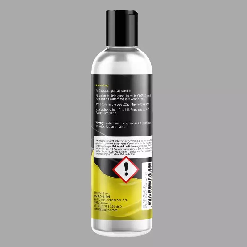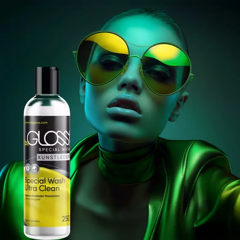 beGLOSS®スペシャルウォッシュ™は人工皮革製品用のヴィーガンクリーニング剤である。汚れや嫌な臭いを優しく、素早く、効果的に取り除き、人工皮革製の衣類やビー・ディー・エス・エムのアクセサリーのお手入れをサポートし、素材の柔軟性を保ち、素材をひび割れから守る。ドイツ製。