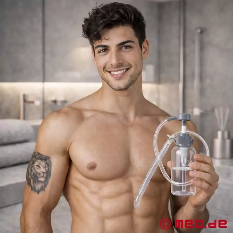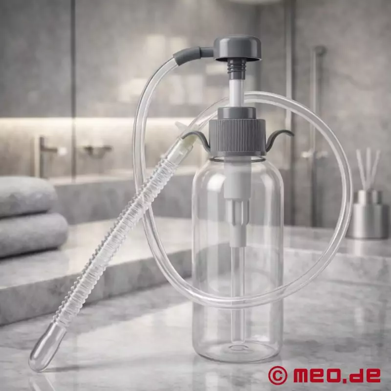 MEO®のAnalatorは、容器、ホース、浣腸ディルドを備えたポンプ装置で、300mlをたっぷり収納できます。アナレーターは、自宅や旅行先で実用的な肛門潅注器です。