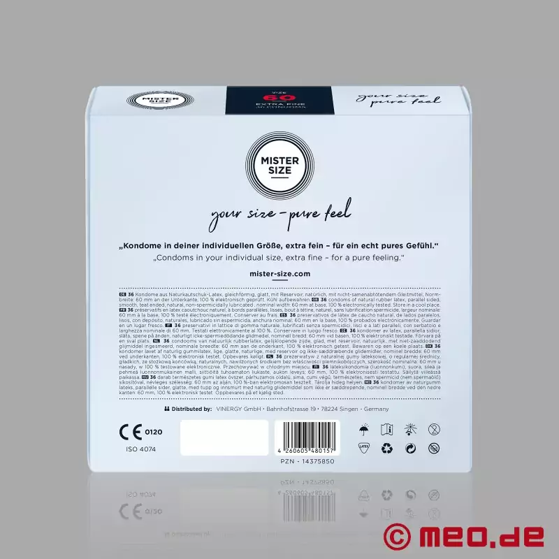 MISTER SIZE™コンドームは、快適な装着感と信頼性の高いプロテクションを同時に提供する。ISO 4074に準拠し、皮膚科学的にテストされ、品質管理プロセスの一環として100%電子テストされている。