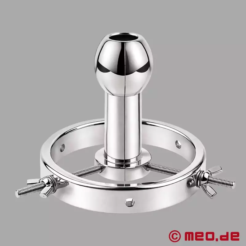 適用は非常に簡単である!リング型鏡の3つの側面(ブレード)は、閉じた状態で約8.5cmの深さに挿入される。均等にねじ込むことによって、拡張はほぼ100mmまで連続的に行われる。Domは約40~100mmまで徐々に拡張を調整し、ゆっくりと、しかし着実にSubを肛門方向に拡張することができる。DAS LOCH 3.0リング鏡は、MEO ®のFUCKSLUTのような潤滑剤で温めて湿らせることで、検査をより快適にすることができる。もちろん、鏡の前など、パートナーなしで使用することもできる。