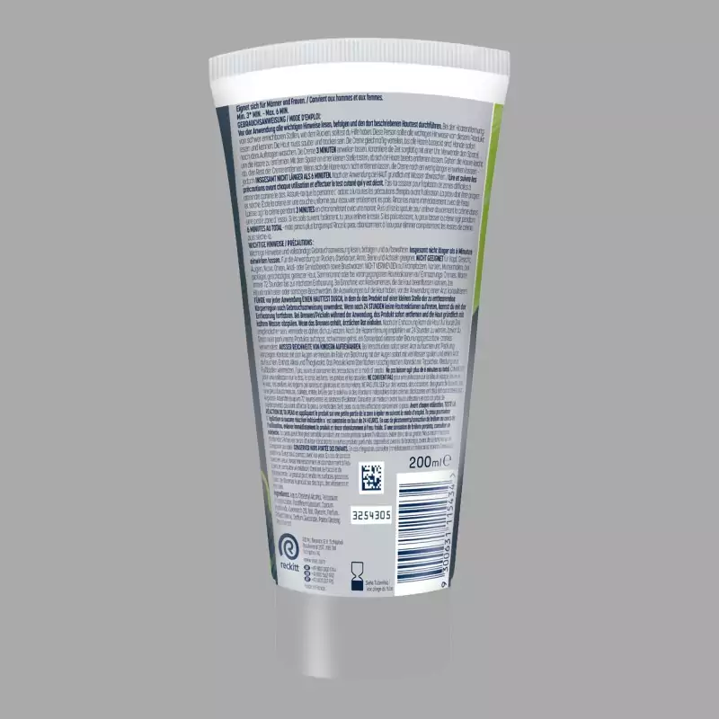 使用前にすべての重要な指示を読み、従う。毛が完全に隠れるようにクリームを均一に塗る。効果は3分後に始まる。3分後、毛がすでに取り除かれているかどうか、小さな面積でテストする。必要であれば、さらに数分間、合計6分以内にクリームを塗ったままにする。