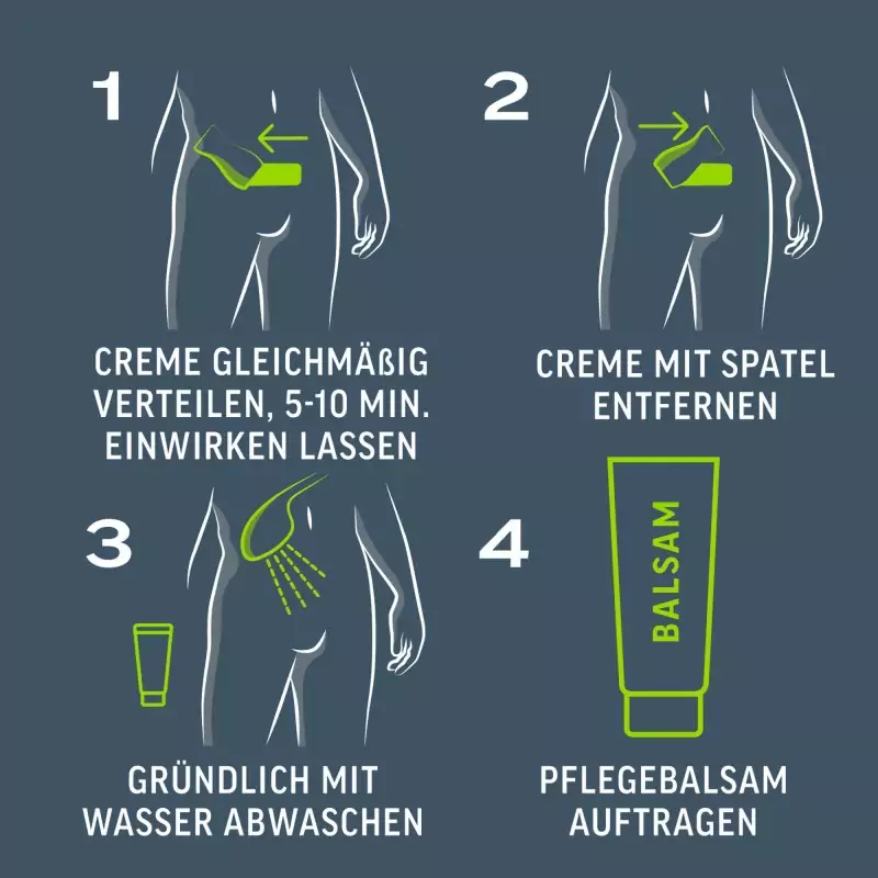 使用前にすべての重要な指示を読み、それに従う。毛が完全に覆われるようにクリームを均一に塗る。効果は5分後に始まる。5分後、毛がすでに取り除かれているかどうか、小さな面積でテストする。必要であれば、さらに数分間、合計10分以内にクリームを塗ったままにする。その後、スパチュラでクリームを取り除き、水で肌を十分に洗い流す。最後にモイスチャライジングバームを塗って肌に栄養を与え、落ち着かせる。