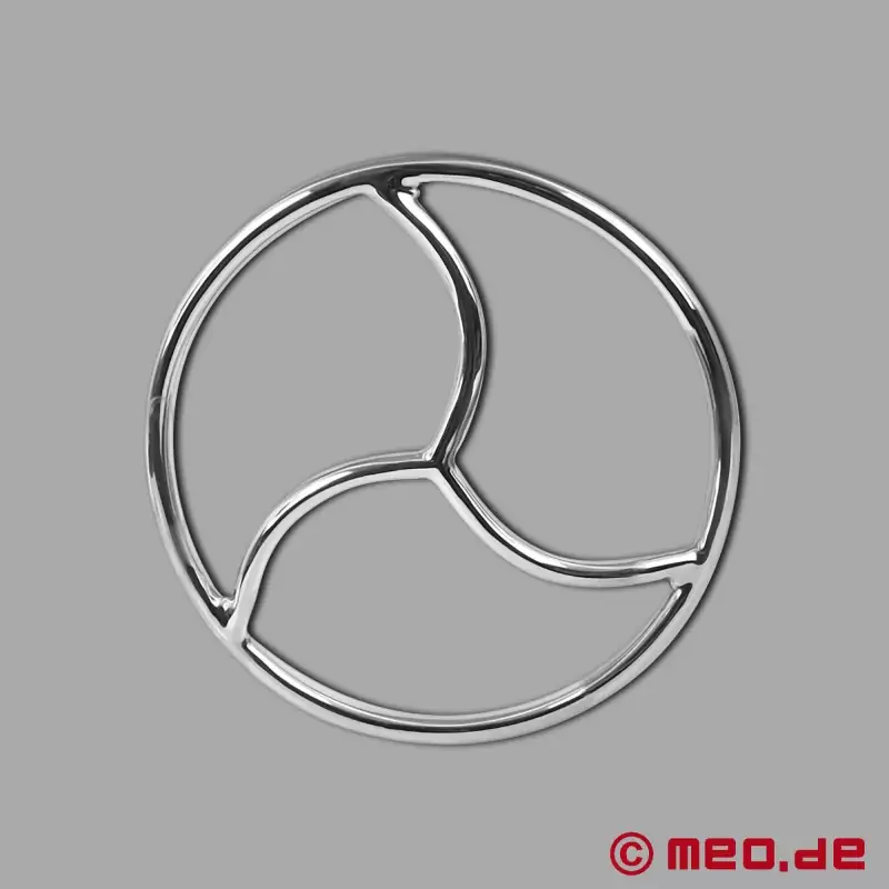 このしばりリングの目を引く特徴は、いわゆる三叉にある。この緊縛リングはステンレス鋼製だ。MEOのしばりリングを使えば、ロープによる吊り上げがずっと簡単になる。ロープは3つのセグメントのいずれかに直接通して引っ張ることができる。これにより、個々のロープをより正確に導くことができ、緊縛中の楽しさと安全性がより保証される。