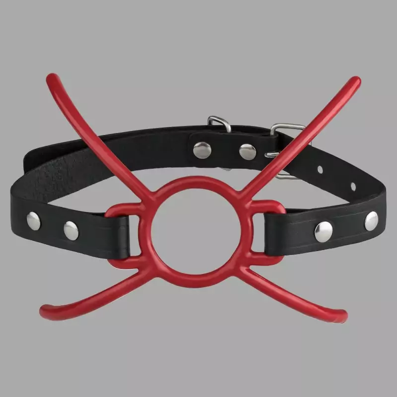 This type of restrictive ring gag was made famous and infamous by Insex films. The round ring has four blunt "thorns".