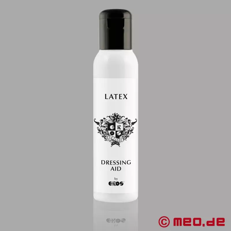 EROS™ ラテックス・ドレッシング・エイドは、皮膚に密着したゴムやラテックスの衣服を着やすくする理想的な製品である。数滴垂らすだけで、ラテックス製衣服やマスクの着用が著しく容易になり、体毛が多い場合でも第二の皮膚のように体にフィットする。