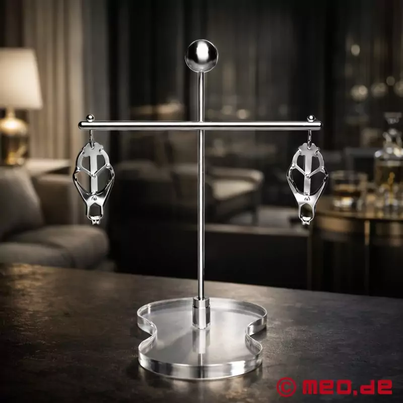 This truly devious device takes nipple play above and beyond the next level! This ingenious instrument allows you to both pull and pinch your sub’s nipples at the same time with a simple twist of the knob. MEO's Tower of Pain comes with a pair of Japanese clover clamps to hang from the firmly attached hooks. These clamps grip harder the more you pull on them so as you turn the knob, the grip gets tighter AND your sub’s nipples are given a good, hard tug. This is quite an impressive set up!