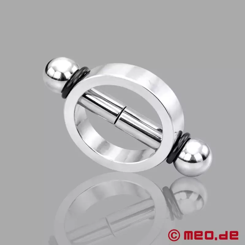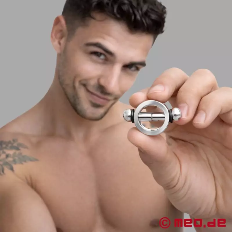 Das Metall-Toy zum stimulierenden Kneifen männlicher Brustwarzen besteht aus einem mächtigen, auf Mattglanz polierten Aluminiumring. Durch ihn ragen zwei Metallstäbchen, die sich gegenüberstehen und an der Spitze kleine Dauermagnete tragen. Da sich die Stäbchen gegenseitig anziehen, üben sie leidlich Druck auf die dazwischen eingeklemmten Nippel aus. Zum Lieferumfang von MEO gehört 1 Paar (= 2 Nipple Pinchers).