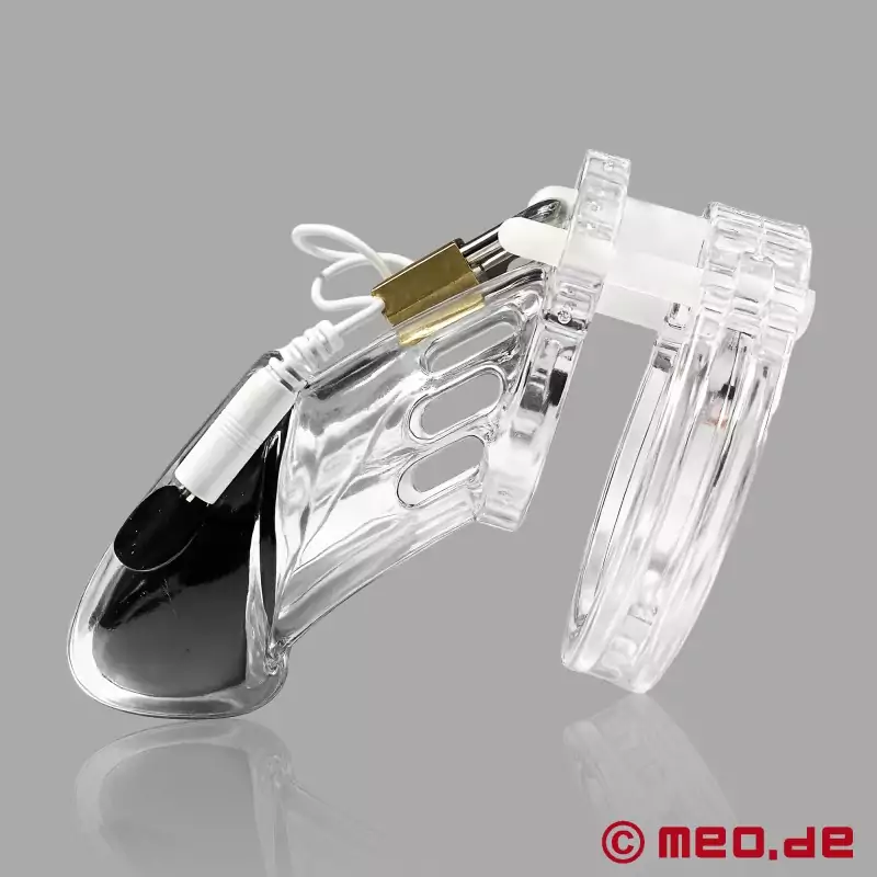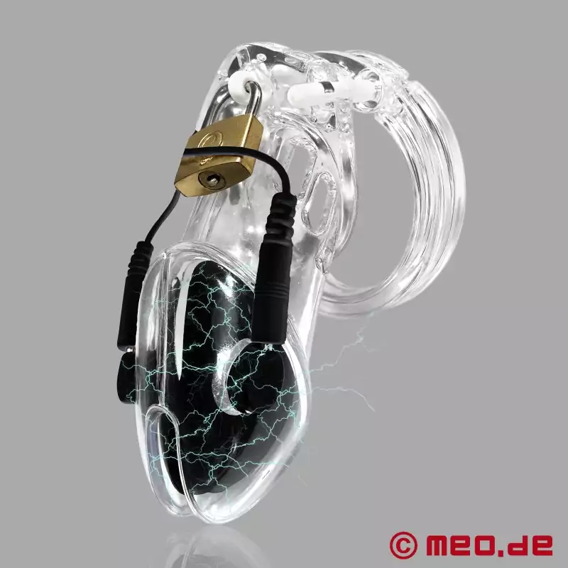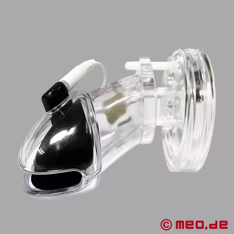 貞操ケージは透明アクリル製で、導電性シリコン・インレイが施されている。導電性の内側コーティングは、ペニスの最も敏感な神経終末に直接正確なインパルスを伝達する。パルスの強さ、リズム、周波数は、リモコンでコントロールできる。小さな警告としての穏やかなピリピリ感から、従順な男性を限界まで追い込む強力な電気ショックまで。電気ユニットは貞操ケージに直接組み込まれているため、外部の電気刺激装置への接続は必要ない。