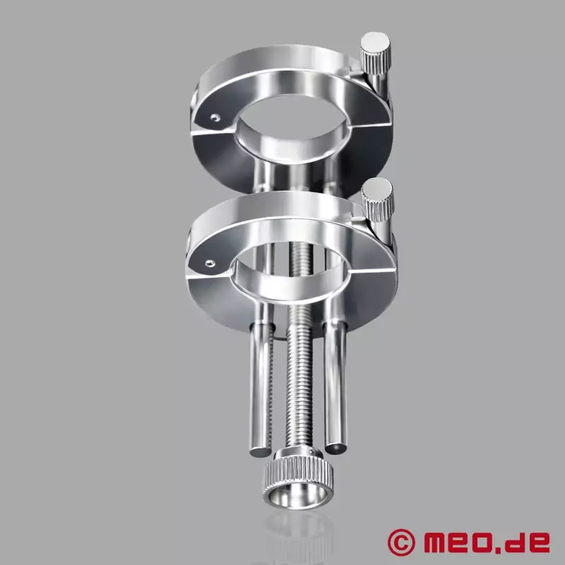 Then you start turning the screws; the first set of screws are for the rings to secure them around the scrotum. The next set screw (the large screw) begins to separate the two rings apart, and thereby stretching the scrotum. This stretch, combined with the built-in weight of the device will give your partner immense testicle pressure. See how far you can go, see how far you can stretch.