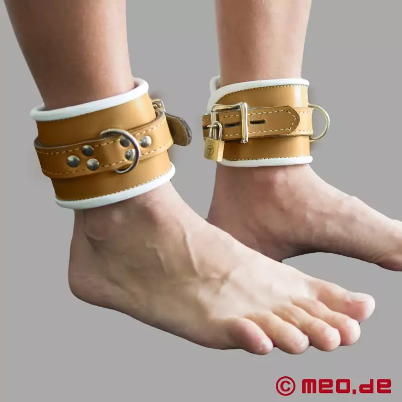 手錠と同じフォーン/ホワイトのカラーコンビネーションの高品質レザーで作られたこの足枷は、その特別な仕上げが特徴で、魅力的な表面と心地よい感触を与えている。