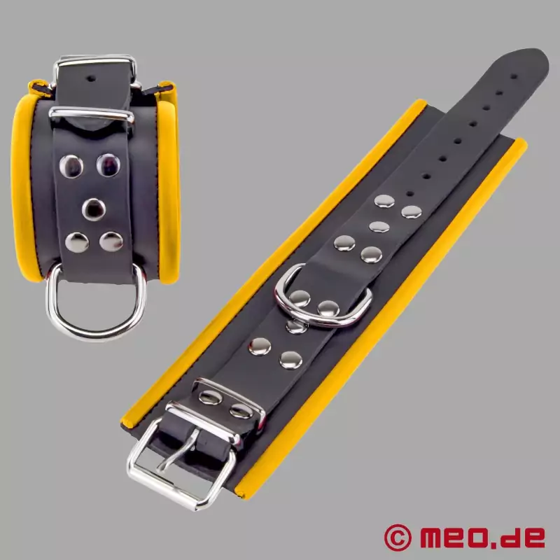 MEOの2色のアンクルカフスは、赤、黄、青、白のアクセントが特徴で、世界的に有名な ハンキーコード.これにより、あなたが何を望んでいるのか、何が好きなのか、何が必要なのか、疑問の余地がなくなる。無防備に縛られ、猿ぐつわを噛まされながら、自分が何に夢中なのかを皆に知らせることもできる。