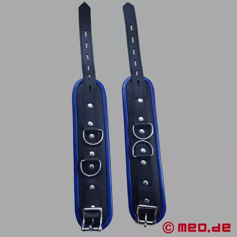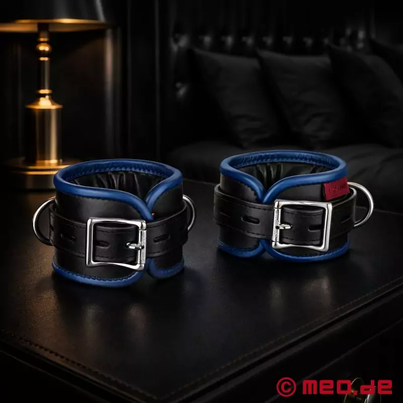 人気の本革製ツートンカラーの足枷は、黒、緑、赤、青、白から選べる。これらの色は、世界中で知られているHanky Codeに似ている。このコードによって、サブは縛られ猿ぐつわをされても、自分の好みやフェチをマスター候補に伝えることができる。