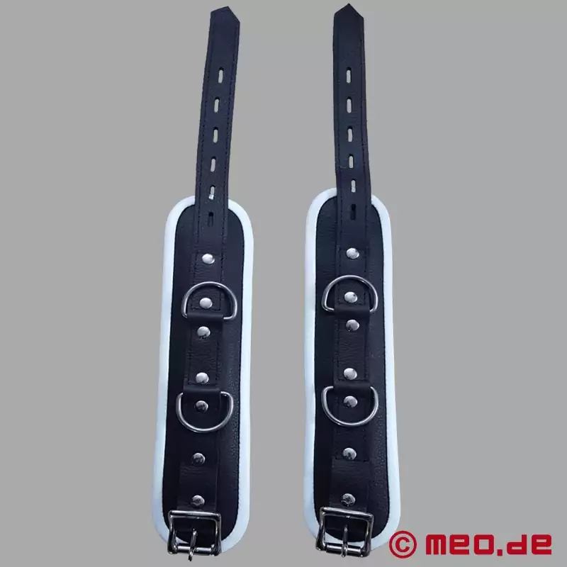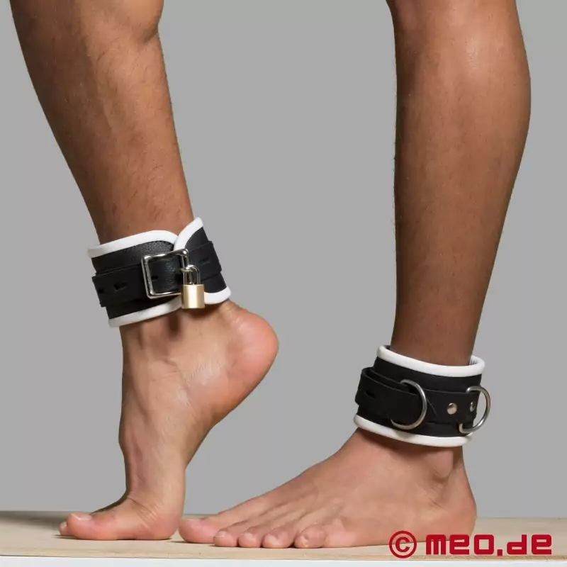 ボンデージ・アンクルカフスは、足首にぴったりとフィットする。この足枷は、金属製のバックルで固定し、サイズを調節することができる。BDSM(ビー・ディー・エス・エム)の足枷には2つのリングが付いており、両方の足枷をチェーンやロープ、または連結用のダブルスナップフックでつなぐことができる。もちろん、このリングはスプレッダーバーを取り付けるのにも使える。MEO ®ボンデージショップで、適切なスプレッダーバーを見つけることができる。