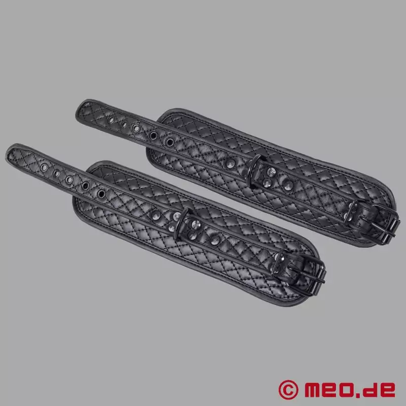 ラグジュアリー、快適さ、プロフェッショナリズムが一組の足枷に:MEO®のBlack Diamond™アンクルカフスは、ソフトなパッド入りの牛革のおかげで人間工学的に足首にフィットし、細い足首にも強い足首にもフィットするよう正確に調節できる。特徴的なダイヤモンドキルティングが足枷のパッドを安定させ、ブラックコーティングのスタッズとバックルがエレガントな黒一色の外観を完成させている。丁寧な仕上がり、高品質のレザー、細部まで考え抜かれたディテールのおかげで、この贅沢な足枷は緊縛をより楽しくするだけでなく、より良く、より安全に感じられる。