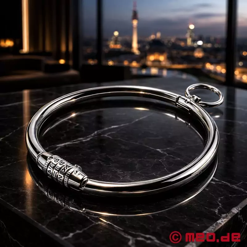 Oリングが付いたチョーカーは、単なるBDSMジュエリーではありません。この首輪はスチール製のネックカフで、内蔵されたコンビネーションロックでロックすることができます。そのため、正しい数字の組み合わせでなければ、首輪を開けることができません。付属のOリングを使えば、チェーンやリーシュ、ロープを取り付けることができます。