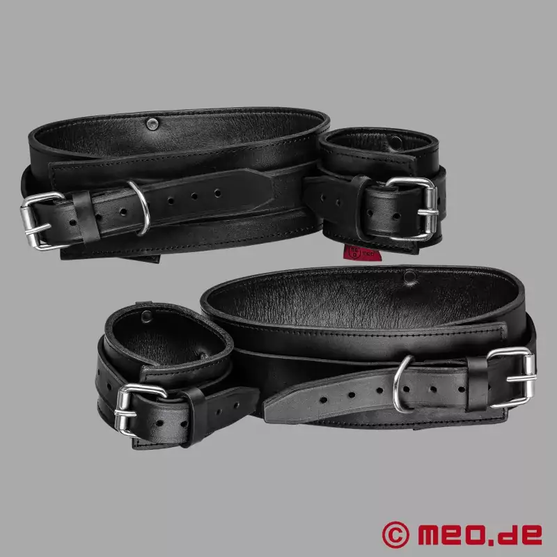 The restraint from MEO Germany locks your sub's calves to her thighs, keeping her in the perfect position for deep, hard fucking - over and over again. Crafted from premium leather and stainless steel, this two-pair restraint set is built to last, feel great, and smell even better. Riveted straps, buckle closures and masculine saddle leather ensure maximum security and timeless kink appeal. Get them on their backs, on their knees, or on your terms. This is bondage built for the long haul.