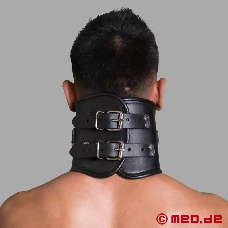 レザー製のBDSMポスチャー・カラーは、頭部の極端な固定を保証し、あらゆる緊縛セッションに究極の刺激を与える。