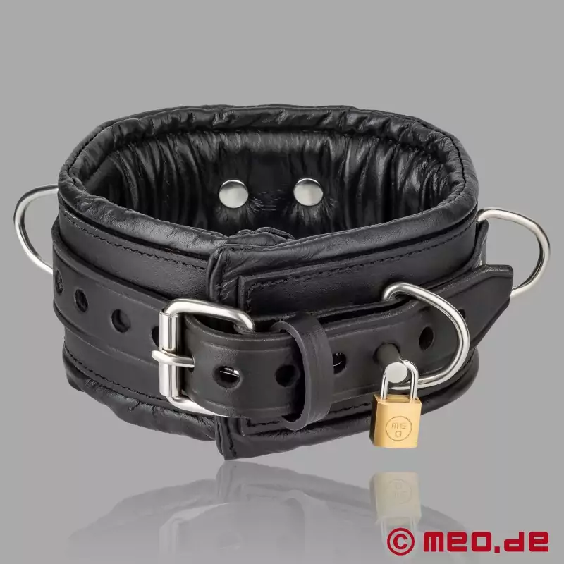 私たちの首輪は、切り口のない多層縫製の牛革製で、ボンデージセッション中に驚くほど多くのバリエーションを可能にする4つの頑丈なスチールリングが装備されている。鍵2本付き南京錠、首輪を収納するための黒いベルベット製バッグ、上質レザーのお手入れ方法が付属する。