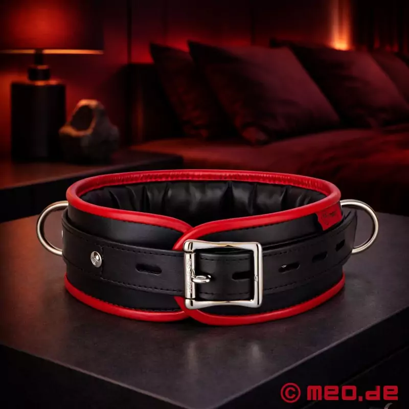 最大限の機能性とクラシカルで美しいデザインが組み合わされている!その結果、表情豊かなカラーのBDSM首輪(ビー・ディー・エス・エム)が誕生した。黒/赤のBDSM首輪には、リードやチェーンを取り付けられるリングが付いている。