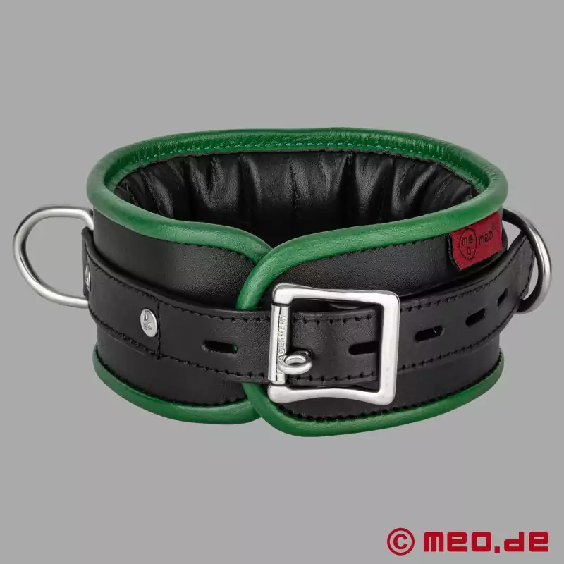 このツートンカラーのBDSM首輪は、黒、緑、赤、青、白から選ぶことができる。これらの色は、世界中で知られているHanky Codeに類似している。このコードに従えば、たとえ縛られ、猿ぐつわをされていても、サブは緊縛中に自分の好きなものやフェチを潜在的なパートナーに伝えることができる。ビー・ディー・エス・エム)レザーの首輪は、ファッション・アクセサリーとして身につけることもできる。
