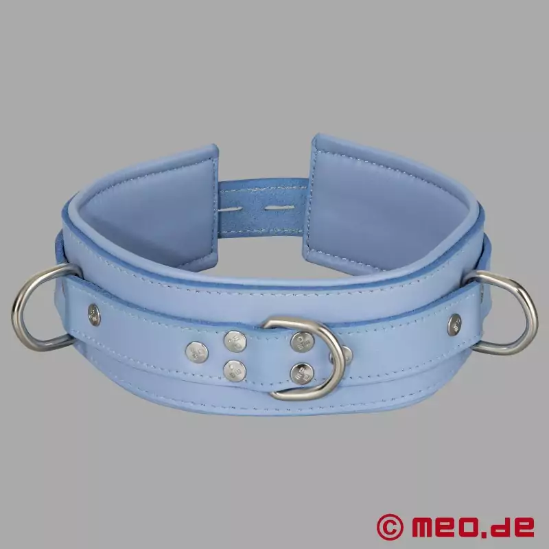 ロック可能なボンデージ・カラーは、ボンデージを再定義する。クラシックなブラックではなく、アズールブルーのプレミアム・レザーが、スタイリッシュな服従と自信に満ちた支配を明確に主張する。この首輪は、自分の情熱を目に見える形で、かつ美的に洗練された方法でアピールしたい人に最適だ。
