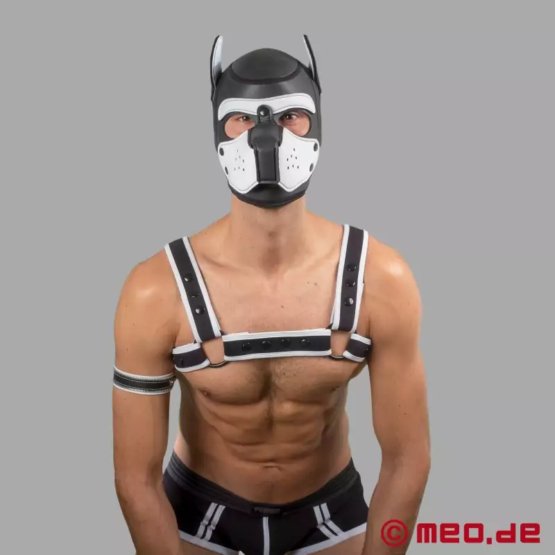 いつでもどこでも、あなたが人間の子犬として良い子であることをアピールしよう!Bad Puppy®のネオプレーンマスク(黒と白)は、忠誠心、明確なシグナル、クラシックな外観を表している。柔らかいネオプレン製のこの犬用マスクには、取り外し可能な口輪が付いており、完璧な着け心地を提供する。